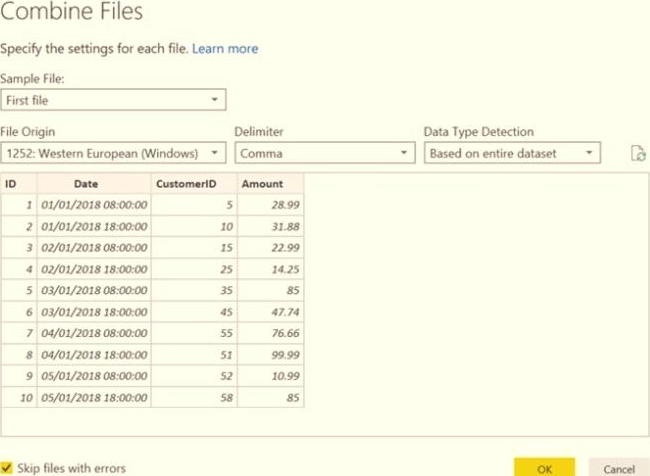 You get data from the folder and select Combine & Load. The Combine Files dialog box is shown in the exhibit. (Click the Exhibit tab.)