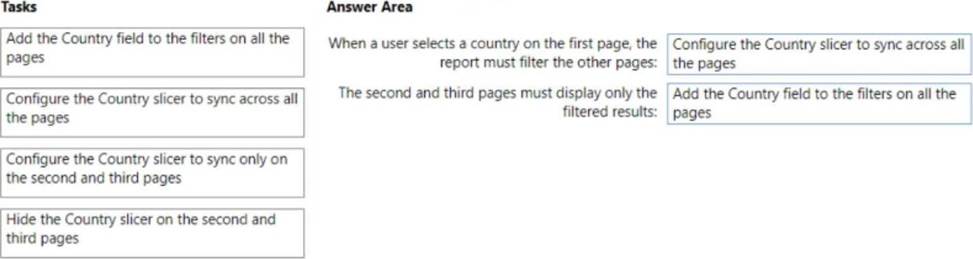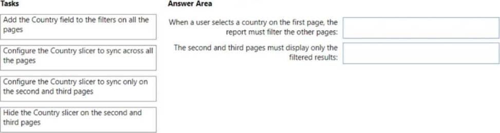 You have a Power Bl report that contains three pages. The pages are used to analyze sales across various countries.