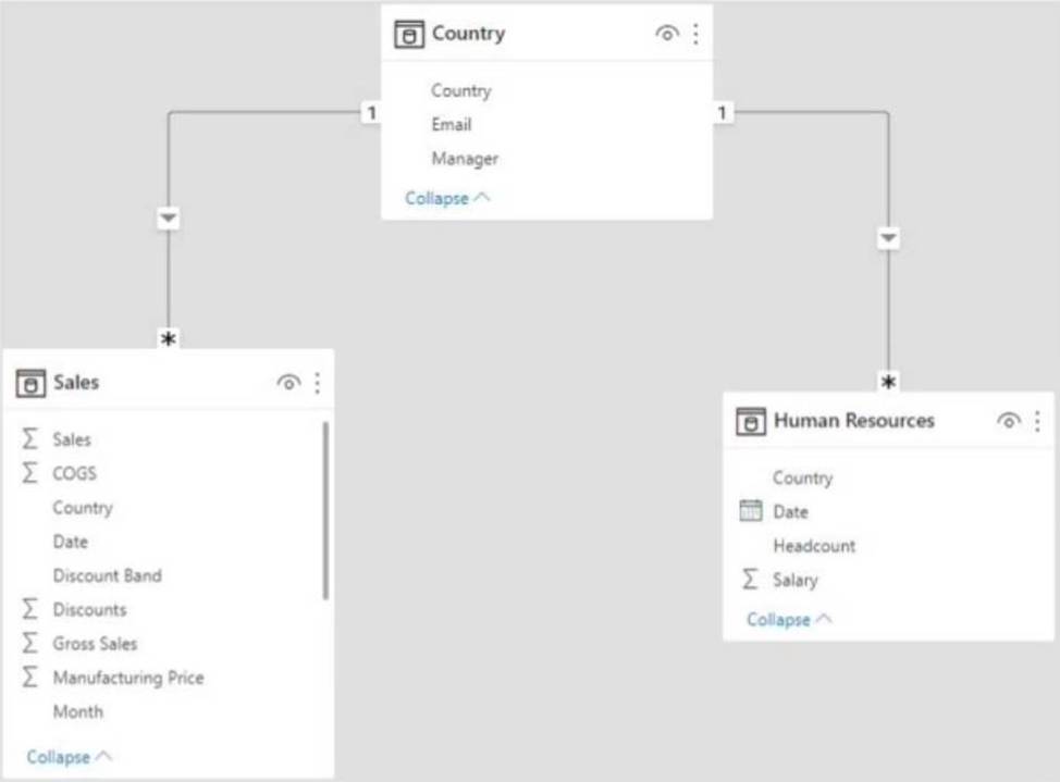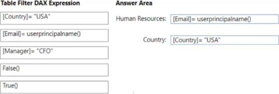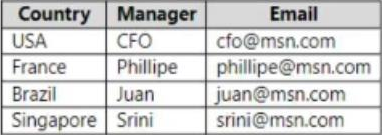 - A . Create a single role that filters Country[Manager_Email] by using the USERNAME DAX function.