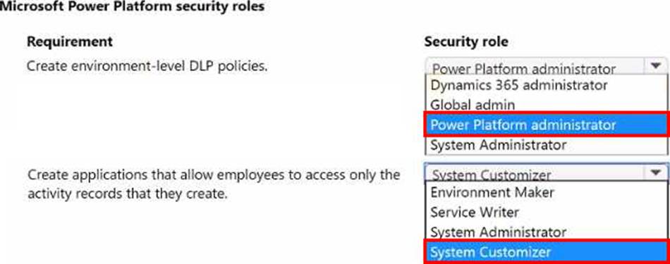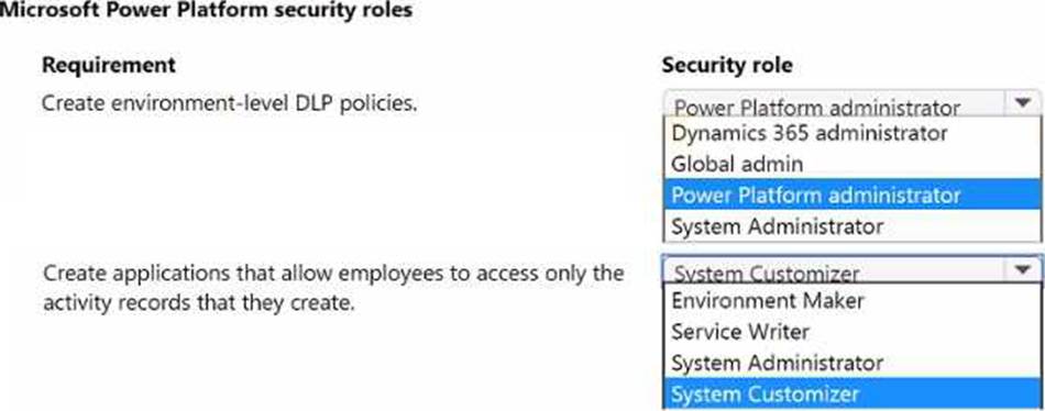 Which security roles should you use? To answer, select the appropriate options in the answer area. NOTE: Each correct selection is worth one point.