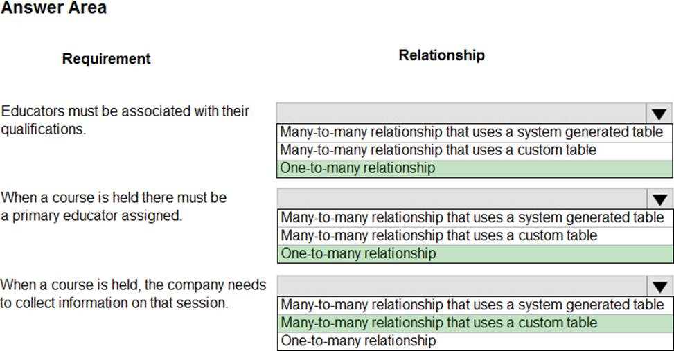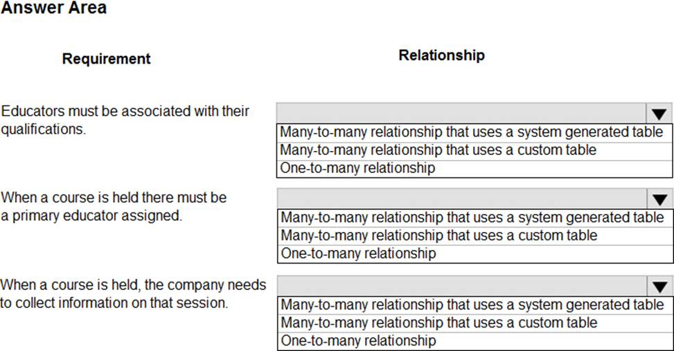 Which type of table relationship should you use? To answer, select the appropriate options in the answer area. NOTE: Each correct selection is worth one point.