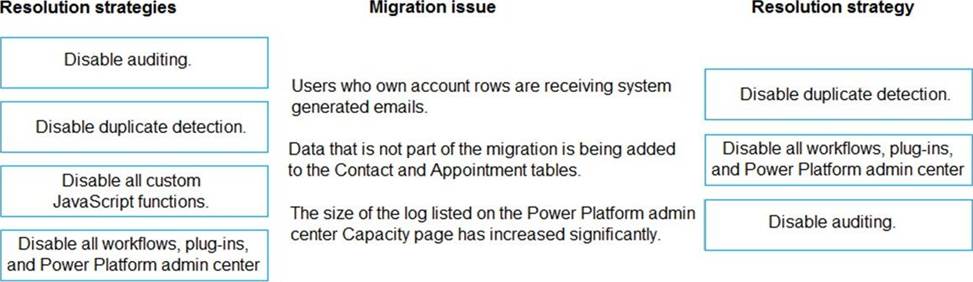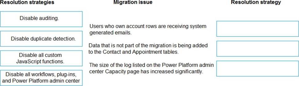 What should you recommend? To answer, drag the appropriate resolution to the correct migration problem. Each resolution may be used once, more than once, or not at all. You may need to drag the split bar between panes or scroll to view content. NOTE: Each correct selection is worth one point.