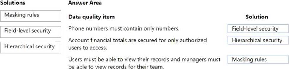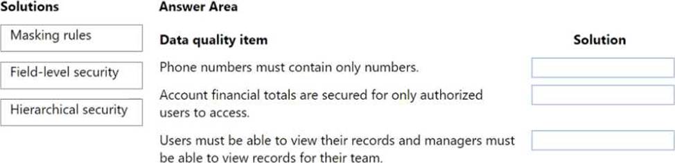 What should you recommend? To answer, drag the appropriate solutions to the correct data quality items. Each solution may be used once, more than once, or not at all. You may need to drag the split bar between panes or scroll to view content. NOTE: Each correct selection is worth one point.
