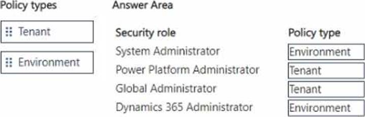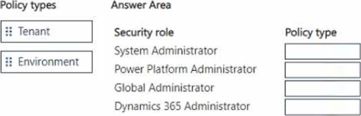Which policy type should you recommend for each security role? To answer, move the appropriate policy types to the correct security roles. You may use each policy type once, more than once, or not at all. You may need to move the split bar between panes or scroll to view content. NOTE: Each correct selection is worth one point.