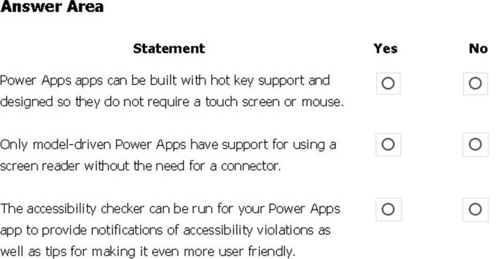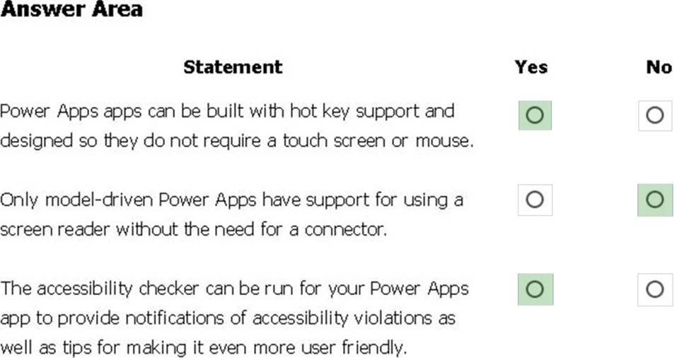 You are creating a model-driven Power Apps app. You want to ensure that the app can be used by individuals who have vision impairments.