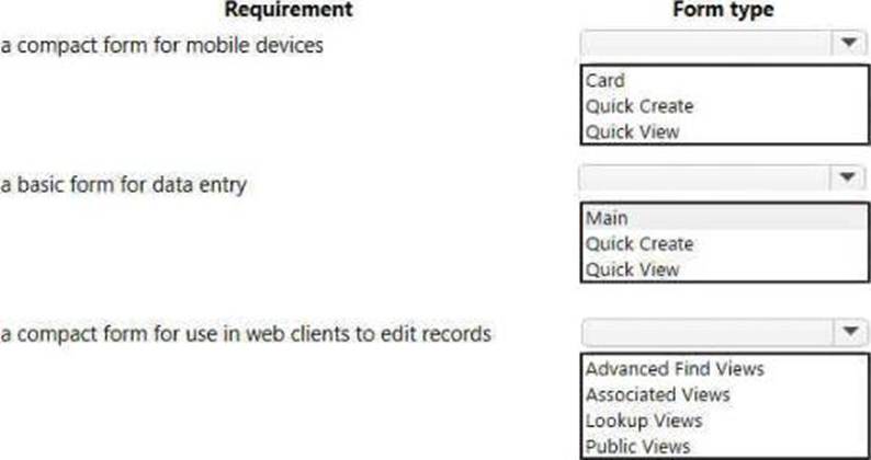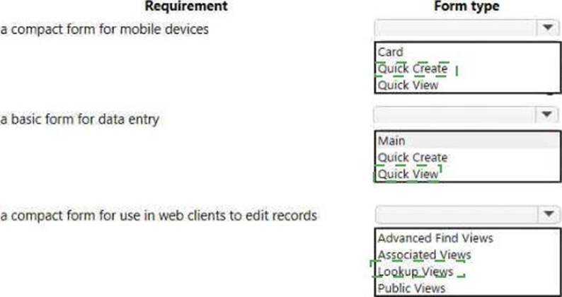 Which form types should you use> To answer, select the appropriate options in the answer area. NOTE: Each correct selection is worth one point.