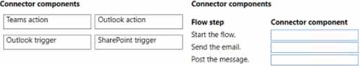 Which connector components should you use to complete the flow? To answer, move the appropriate connector component to the correct flow step. You may use each connector component once, more than once, or not at all. You may need to move the split bar between panes or scroll to view content. NOTE: Each correct selection is worth one point.