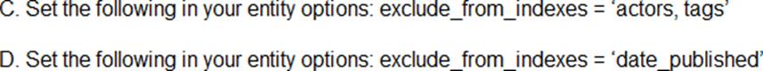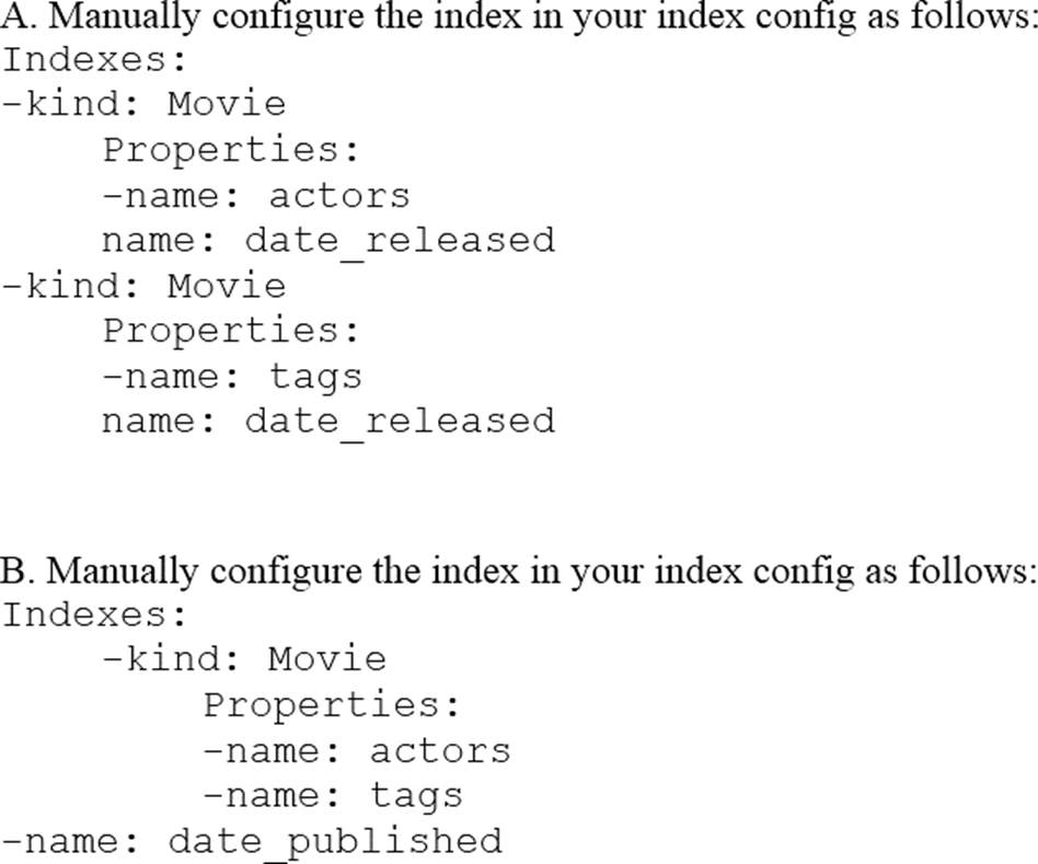 You are deploying a new storage system for your mobile application, which is a media streaming service. You decide the best fit is Google Cloud Datastore. You have entities with multiple properties, some of which can take on multiple values. For example, in the entity ‘Movie’ the property ‘actors’ and the property ‘tags’ have multiple values but the property ‘date released’ does not. A typical query would ask for all movies with actor=<actorname> ordered by date_released or all movies with tag=Comedy ordered by date_released.
