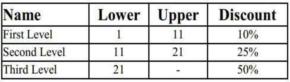 Universal Containers has a slab Discount Schedule for Product A with these Discount Tiers: