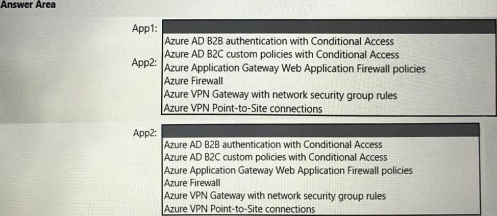 What should you use to meet the requirement of each app? To answer, select the appropriate options in the answer area. NOTE: Each correct selection is worth one point.