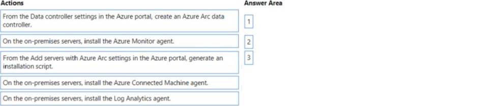 To configure Defender for Cloud to support the on-premises servers, you should perform the following three actions in sequence: