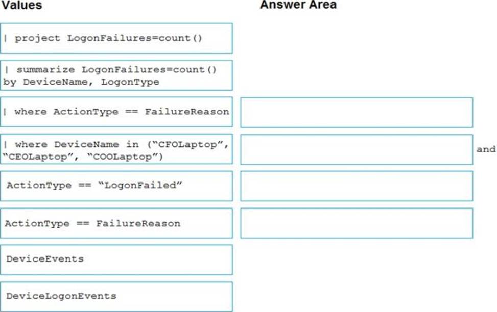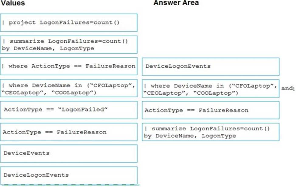 You need to create an advanced hunting query to count failed sign-in authentications on three devices named CFOLaptop. CEOLaptop, and COOLaptop.