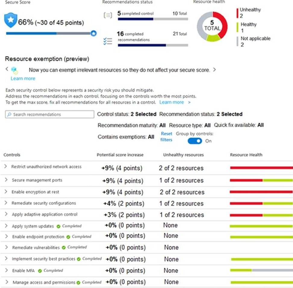 The secure score in Azure Security Center is shown in the Security Center exhibit. (Click the Security Center tab.)