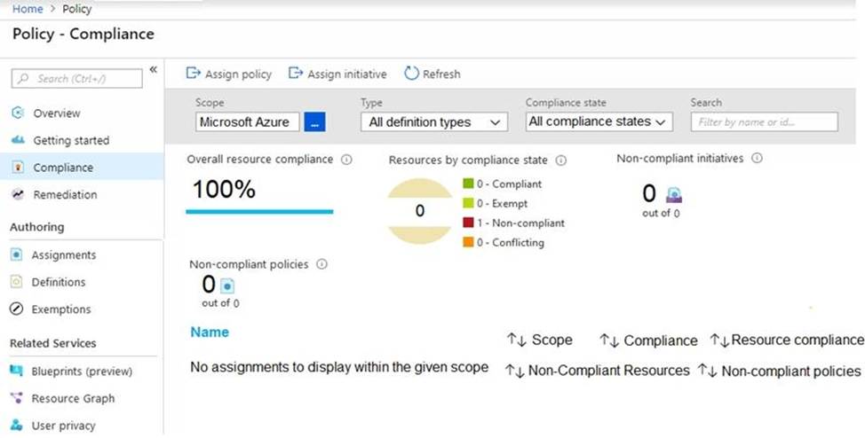 Azure Policy assignments are configured as shown in the Policies exhibit. (Click the Policies tab.)