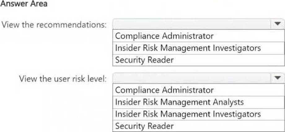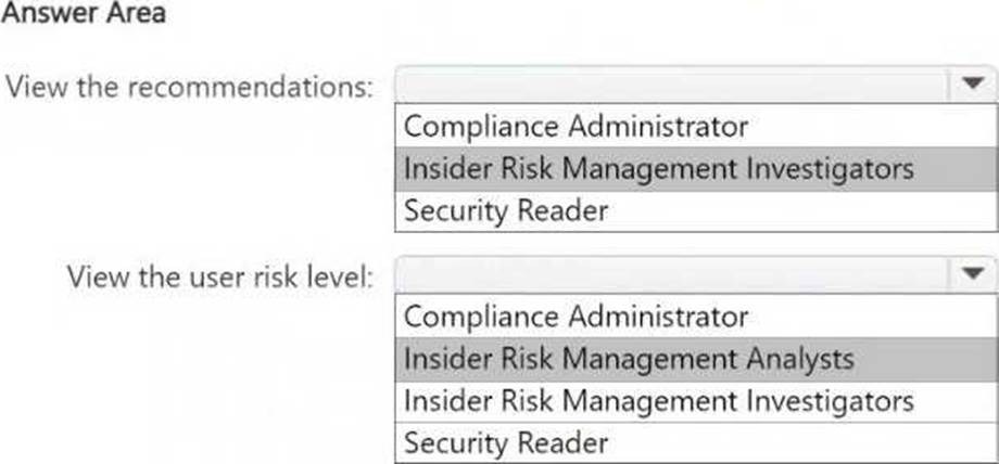 Box 1: The Insider Risk Management Investigators role allows users to view recommendations related to insider risk cases and Microsoft Purview DSPM for AI insights. This role is appropriate because it grants access to review AI-related risk recommendations without unnecessary administrative privileges.