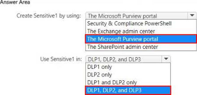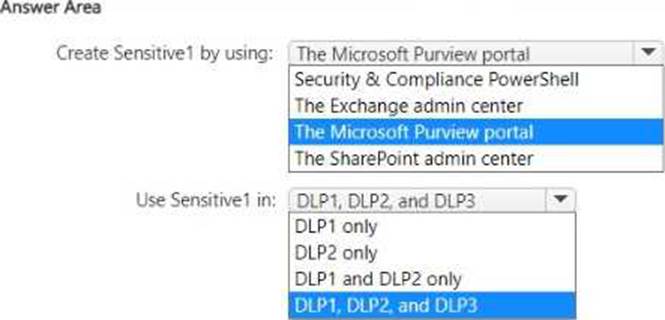 What should you use to create Sensitive1, and in which DLP policies can you use Sensitive1? To answer, select the appropriate options in the answer area. NOTE: Each correct selection is worth one point.