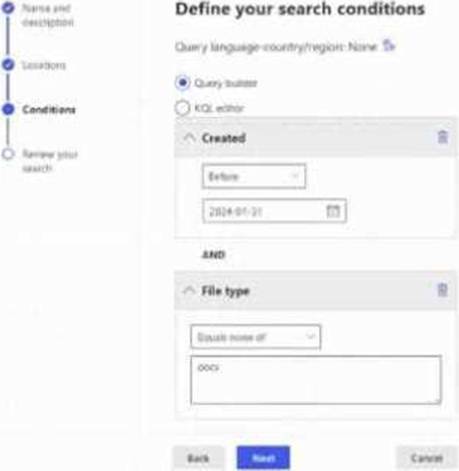 From the Microsoft Purview compliance portal, for Site1 you create a content search named Search1 that has the date in the YYYY-MM-DD format as shown in the following exhibit.