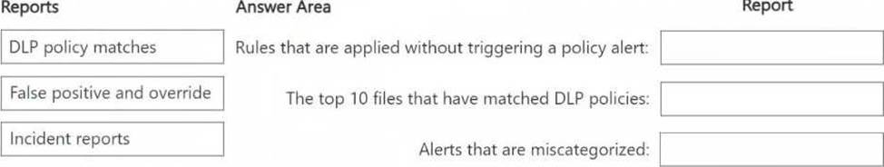 Which report should you use for each requirement? To answer, drag the appropriate reports to the correct requirements. Each report may be used once, more than once, or not at all. You may need to drag the split bar between panes or scroll to view content. NOTE: Each correct selection is worth one point.