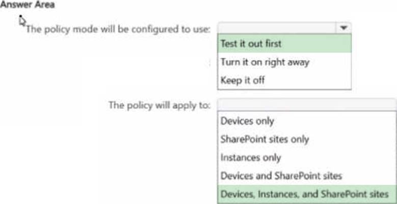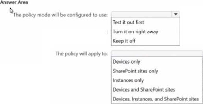 How will the policy be configured? To answer, select the appropriate options in the answer area NOTE: Each correct selection is worth one point.