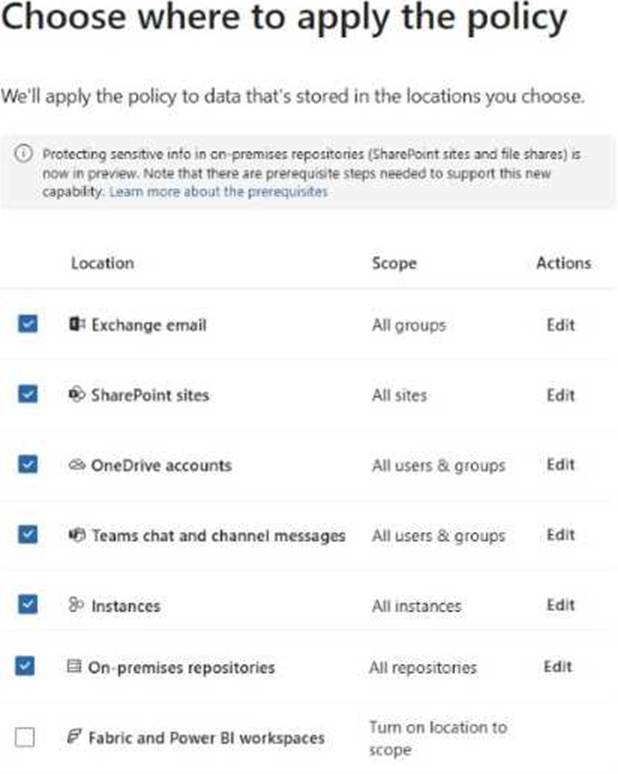 You are creating a DLP policy named Policy1 that will be applied to the locations as shown in the following exhibit.