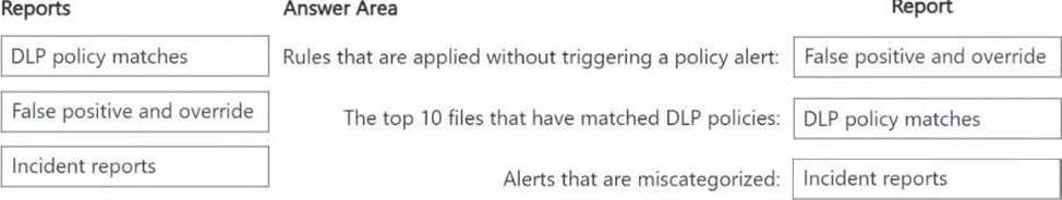 Which report should you use for each requirement? To answer, drag the appropriate reports to the correct requirements. Each report may be used once, more than once, or not at all. You may need to drag the split bar between panes or scroll to view content. NOTE: Each correct selection is worth one point.