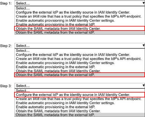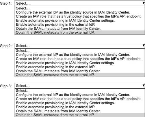 IAM Identity Center acts as the service provider (SP) in the SAML trust. The external IdP must trust IAM Identity Center, so the IdP needs IAM Identity Center’s SAML metadata first. This metadata contains critical information such as the SP entity ID, ACS (Assertion Consumer Service) URL, and signing certificate. Without this metadata, the external IdP cannot be configured to send assertions to AWS.