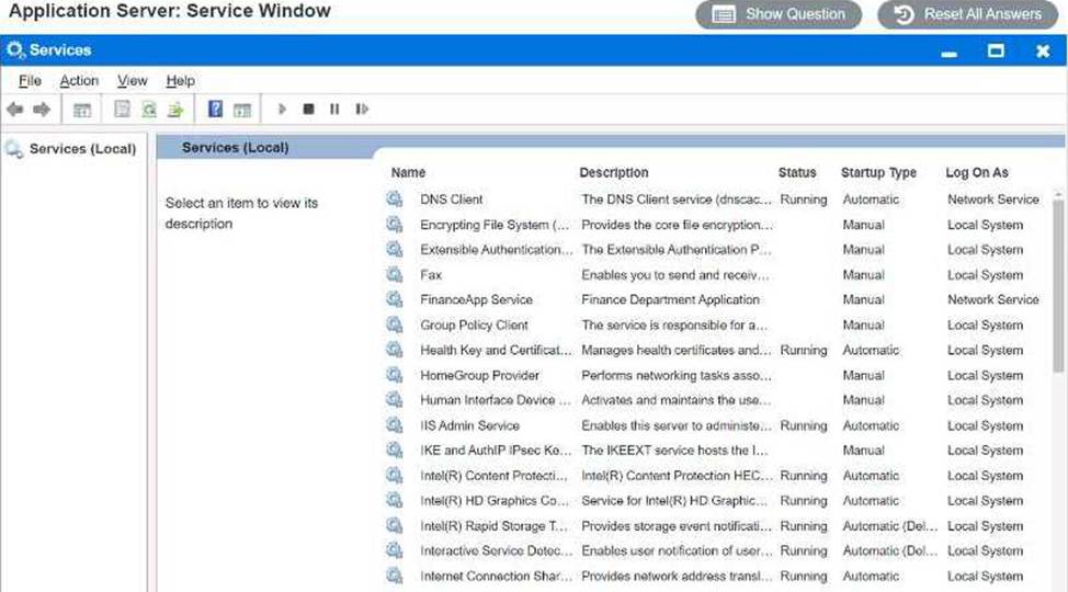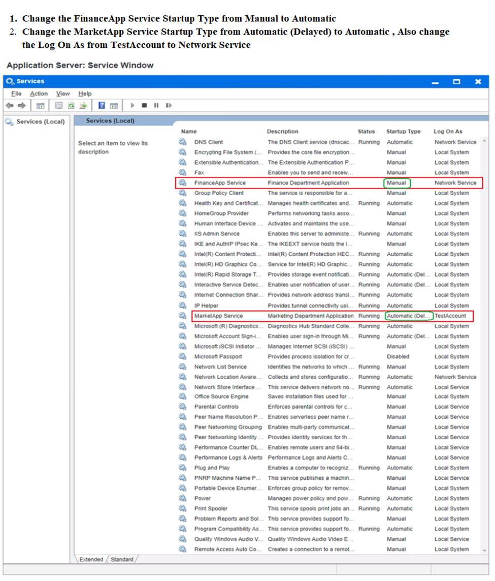 Using the Services menu provided, modify the appropriate application services to remedy the stated issues.