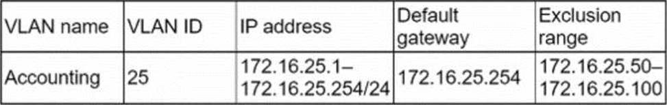 The IP address configuration that the technician should assign to the new server so the members of the accounting group can access the server is 172.16.25.90/24 for the IP address and 172.16.25.254 for the default gateway. This configuration matches the VLAN identified in the image, which has a network address of 172.16.25.0/24 and a subnet mask of 255.255.255.0. The IP address of the server must be within the same network range as the VLAN, which is from 172.16.25.1 to 172.16.25.254, excluding the network and broadcast addresses (172.16.25.0 and 172.16.25.255). The default gateway of the server must be the same as the VLAN, which is 172.16.25.254, to allow communication with other networks or devices outside the VLAN.