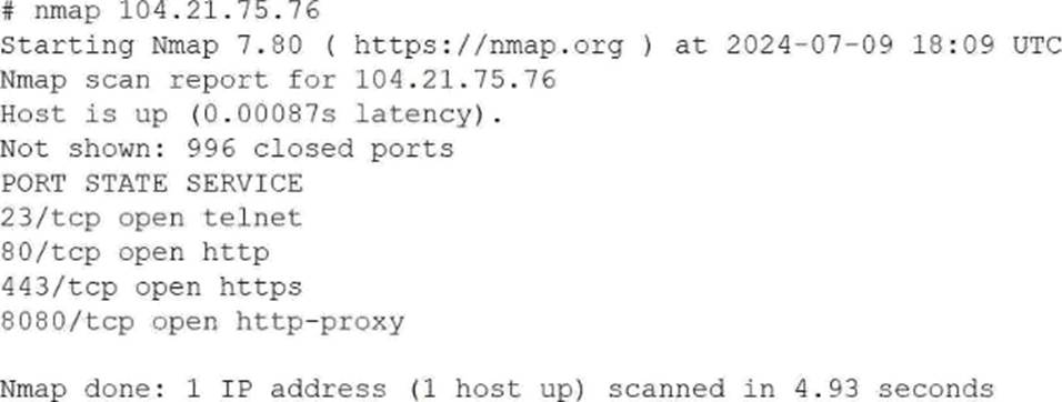 This scenario falls under the Security domain of the CompTIA Linux+ V8 objectives and focuses on system hardening and service minimization. The Nmap scan output reveals that port 23 (Telnet) is open on the system, which represents a significant security risk.